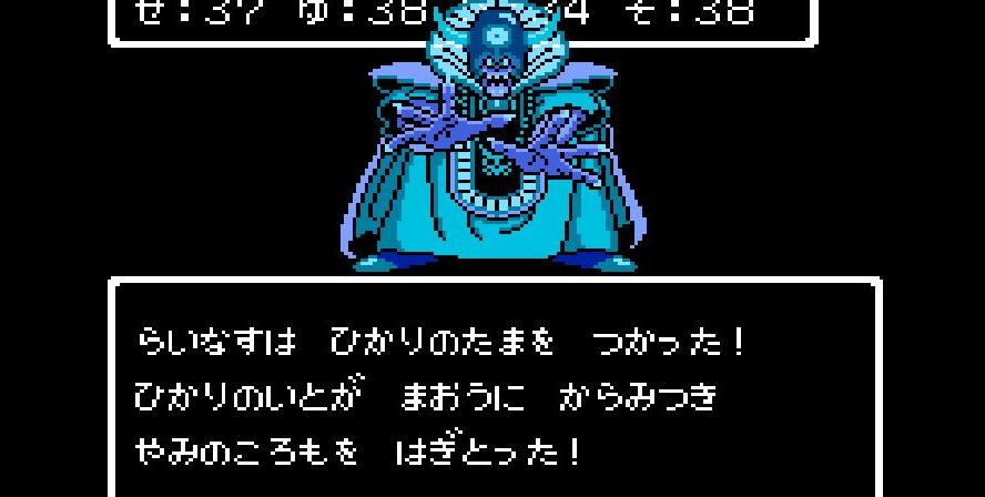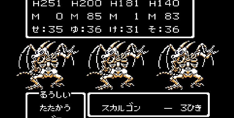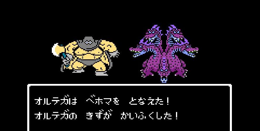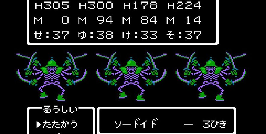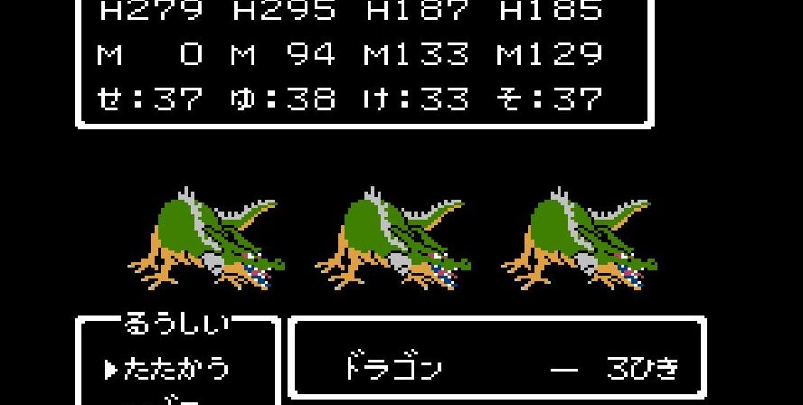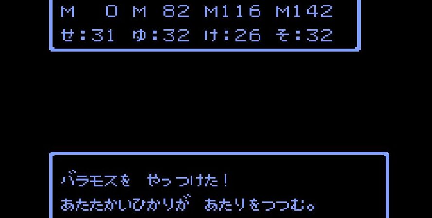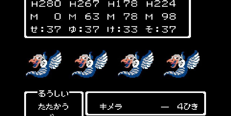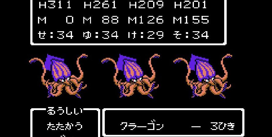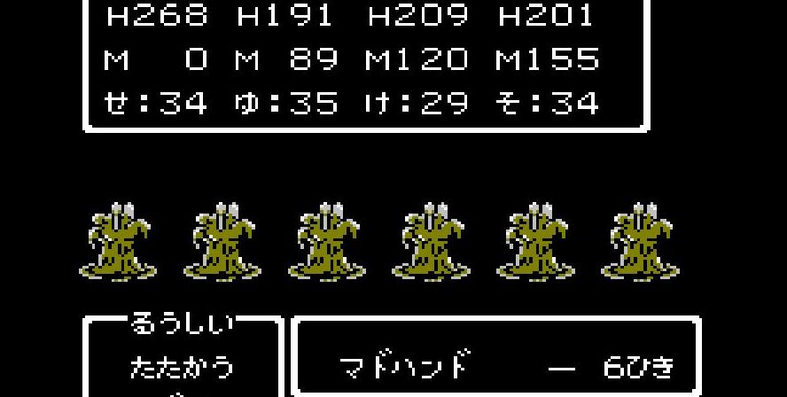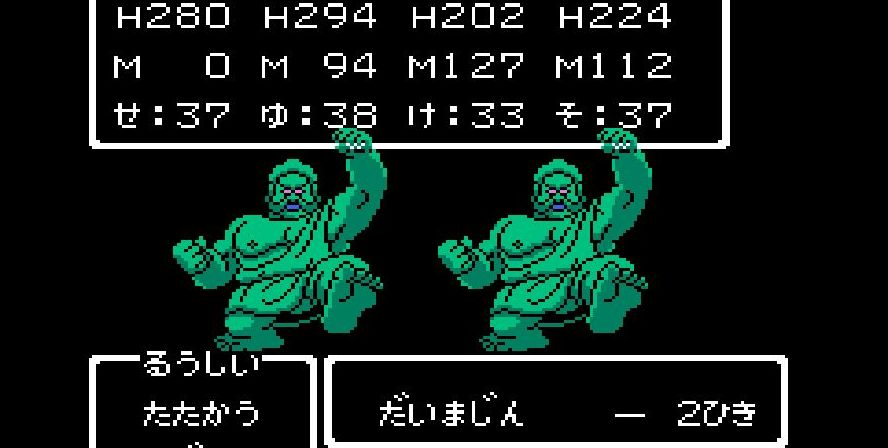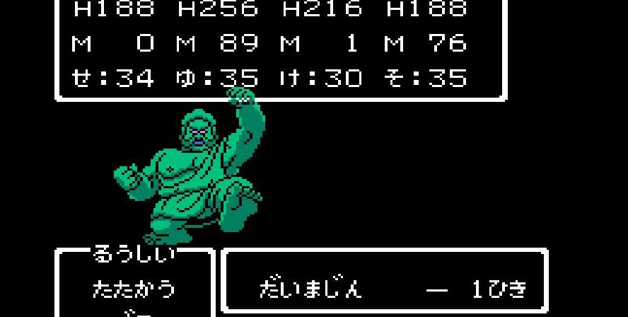 そこからは簡単だった。戦士は剣で切り裂き、勇者と賢者、僧侶が「ベホマ」攻撃を連発し、HPが危うくなったら「賢者の石」で補給。計1589ポイントを与えて撃破。