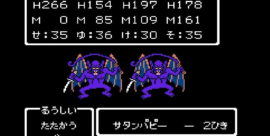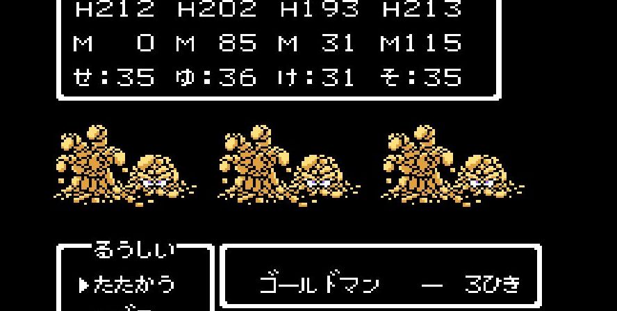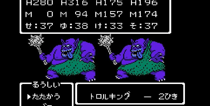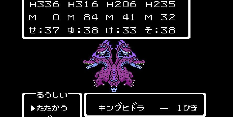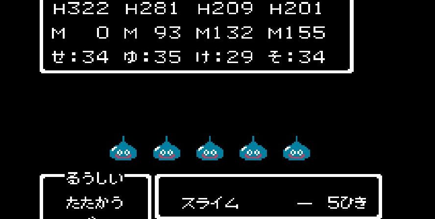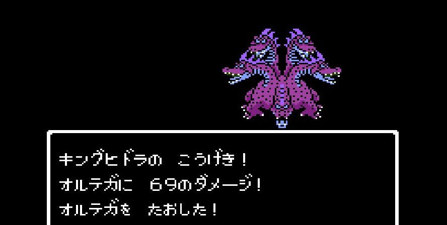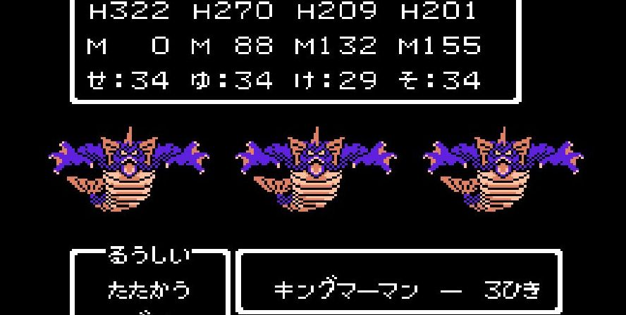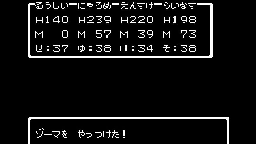 そこからは簡単だった。戦士は剣で切り裂き、勇者と賢者、僧侶が「ベホマ」攻撃を連発し、HPが危うくなったら「賢者の石」で補給。計1589ポイントを与えて撃破。